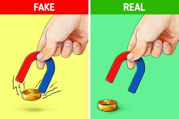 Vàng thật không bị ảnh hưởng bởi lực hút của nam châm như các kim loại khác. Ta chỉ cần đặt nam châm với vàng muốn thử, nếu hút nhau thì không phải, còn nếu không có tác động gì thì là vàng thật.